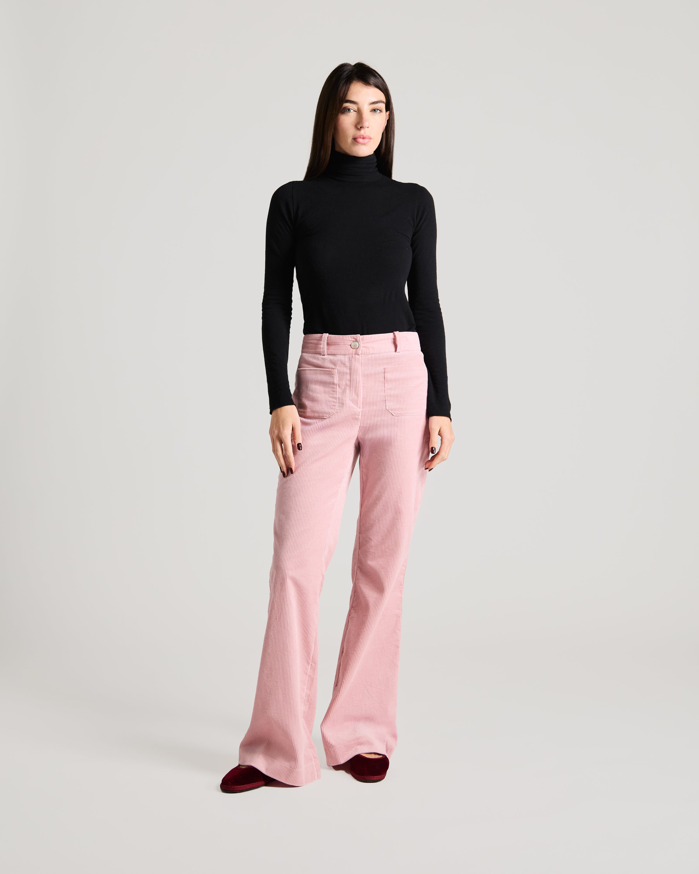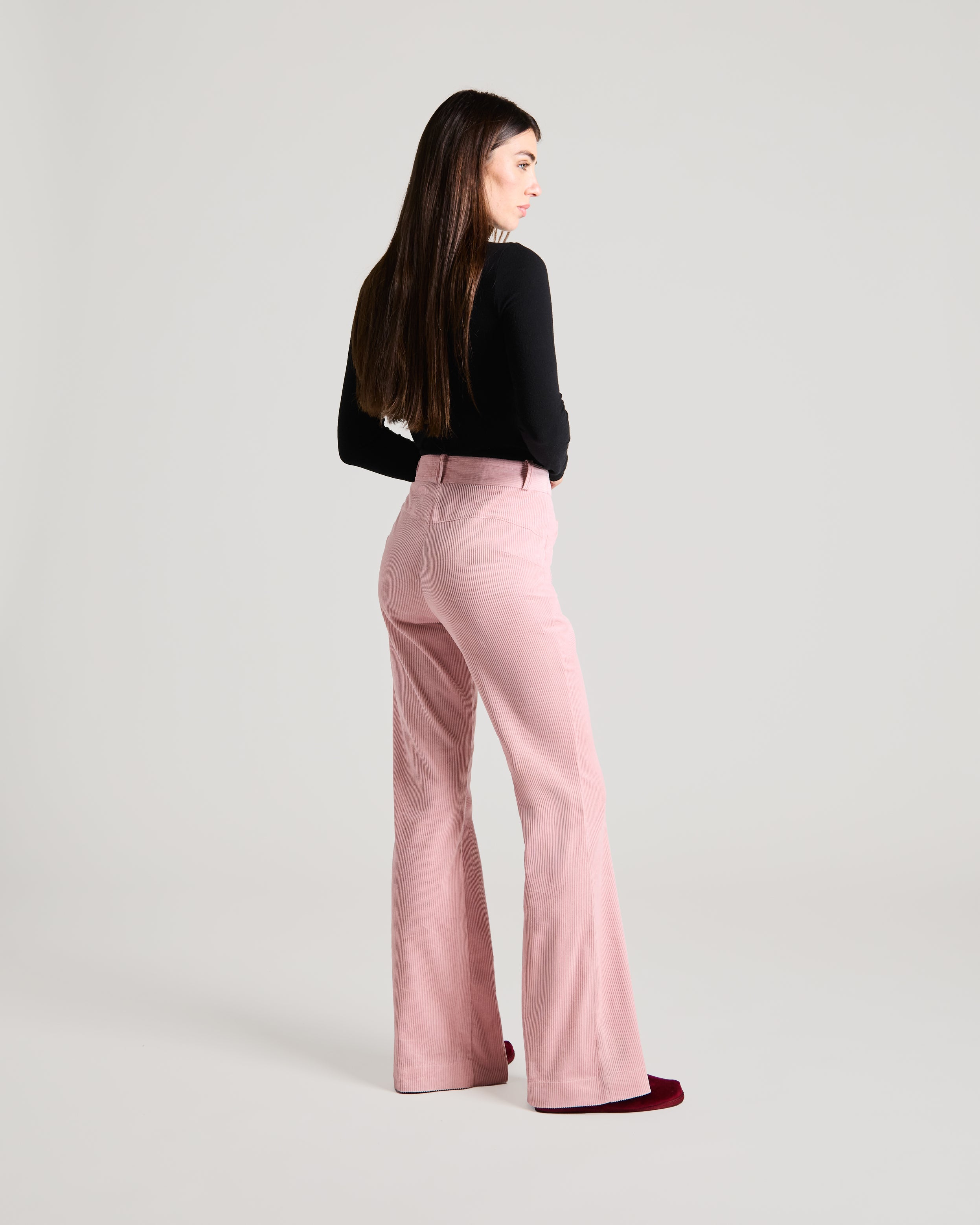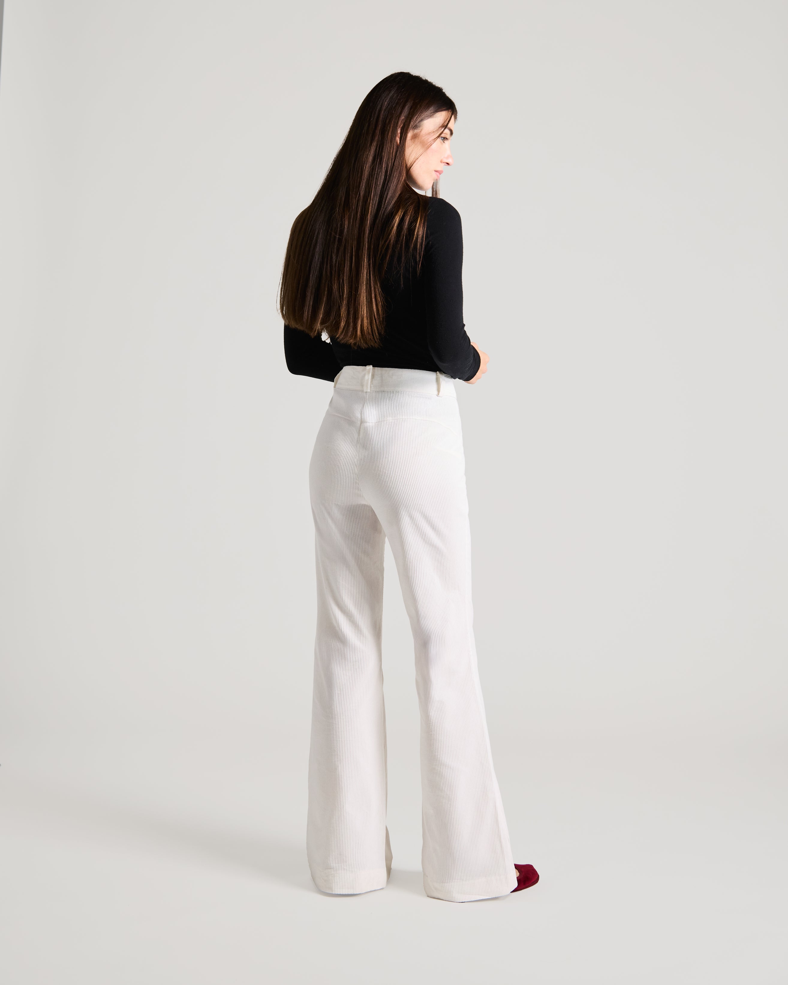 Per la mamma: Un pantalone in velluto a costine luminoso, con taschine, fodera interna e caduta fluida che accompagna ogni movimento. Il taglio lo rende versatile e adatto sia a un look casual sia a uno più sofisticato. Disponibile in bianco, beige e rosa, diventa il filo sottile che unisce comfort e raffinatezza.