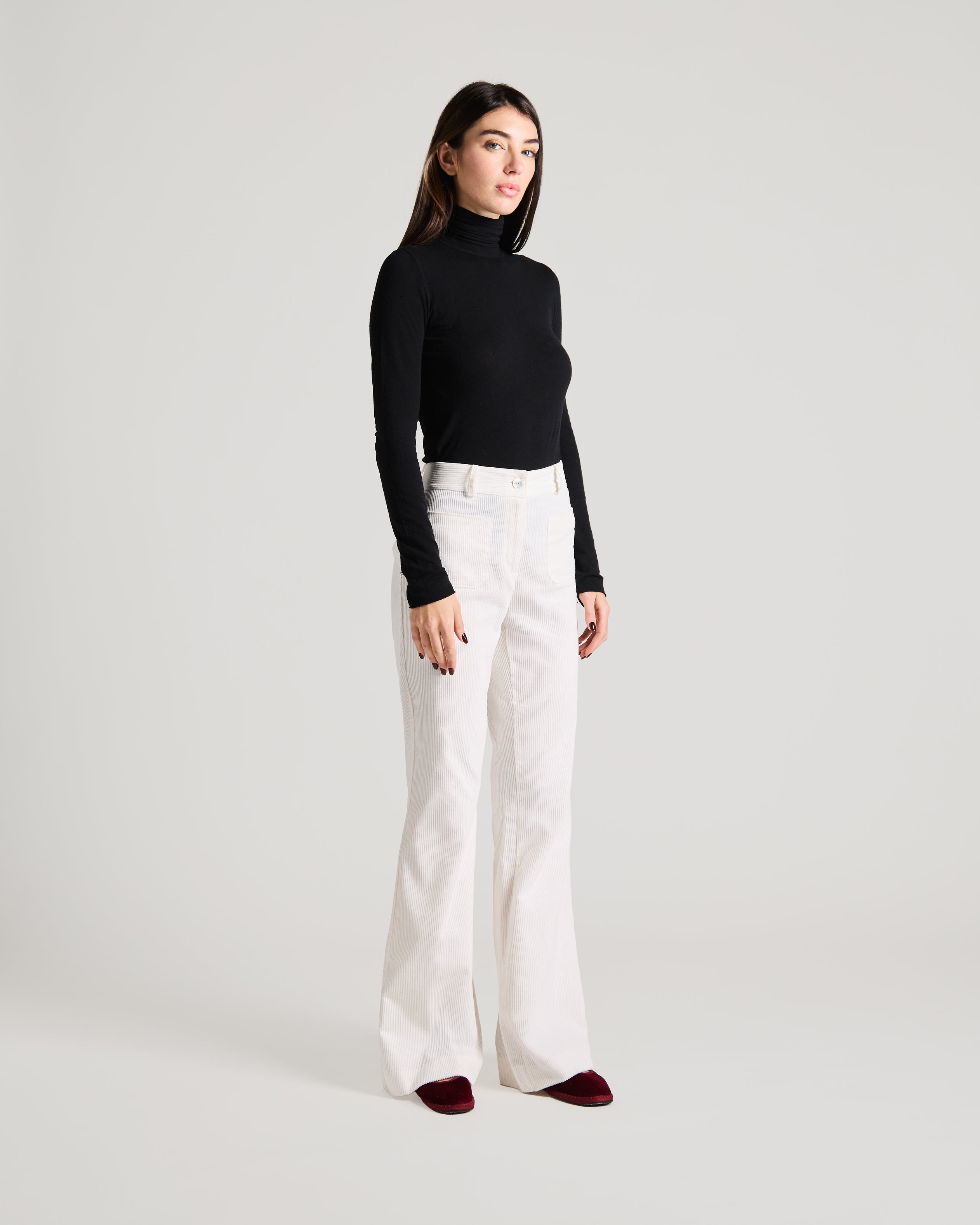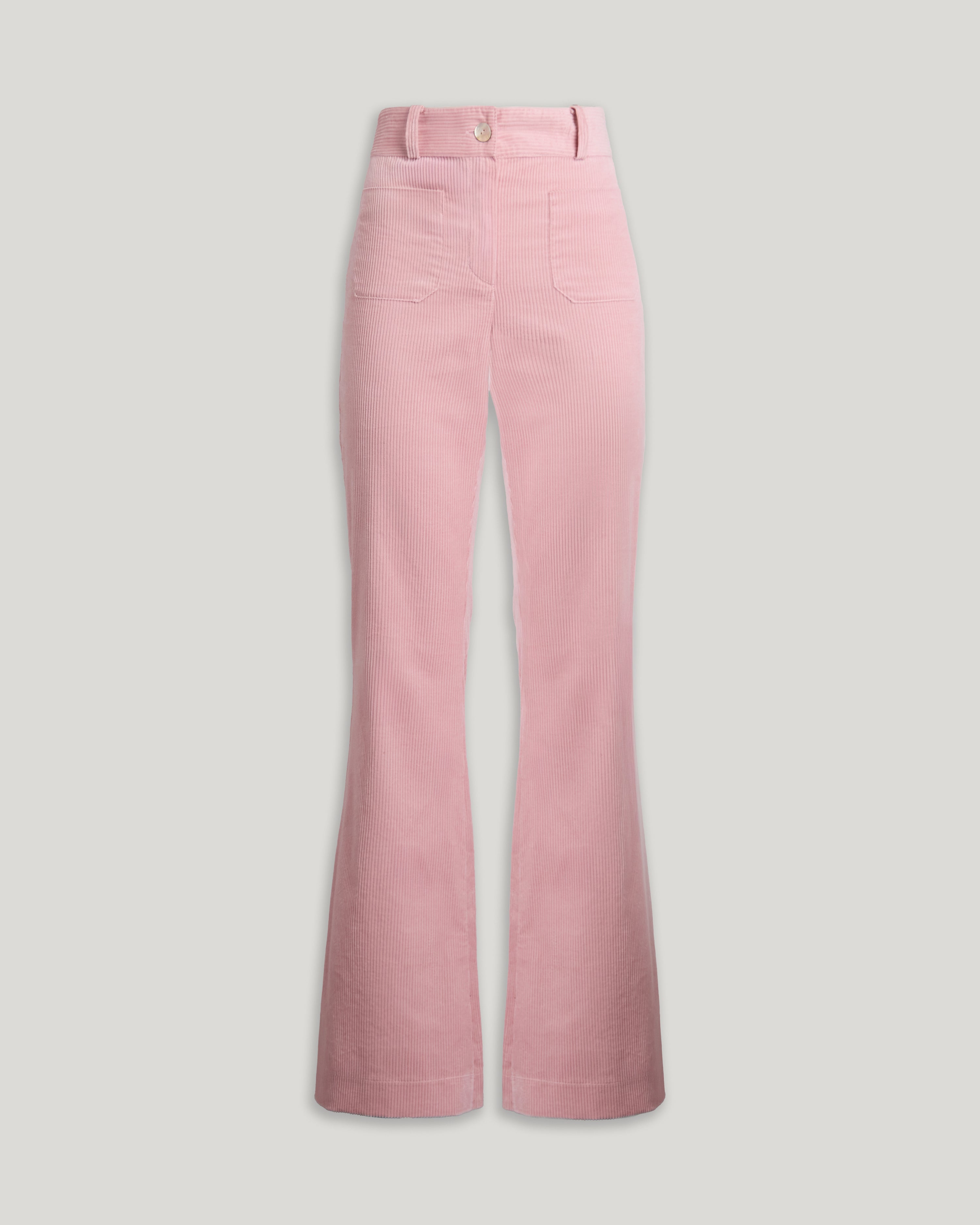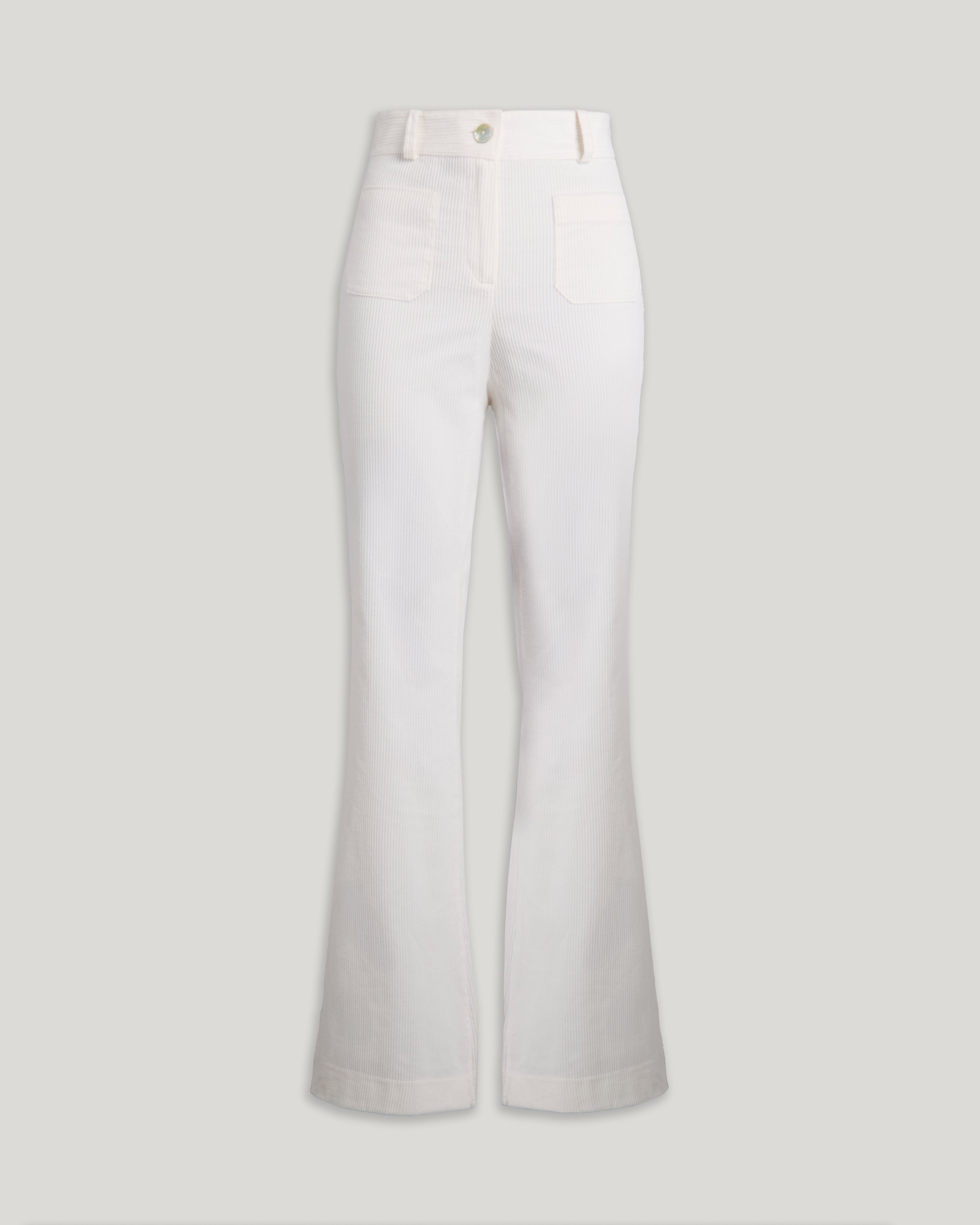 Per la mamma: Un pantalone in velluto a costine luminoso, con taschine, fodera interna e caduta fluida che accompagna ogni movimento. Il taglio lo rende versatile e adatto sia a un look casual sia a uno più sofisticato. Disponibile in bianco, beige e rosa, diventa il filo sottile che unisce comfort e raffinatezza.