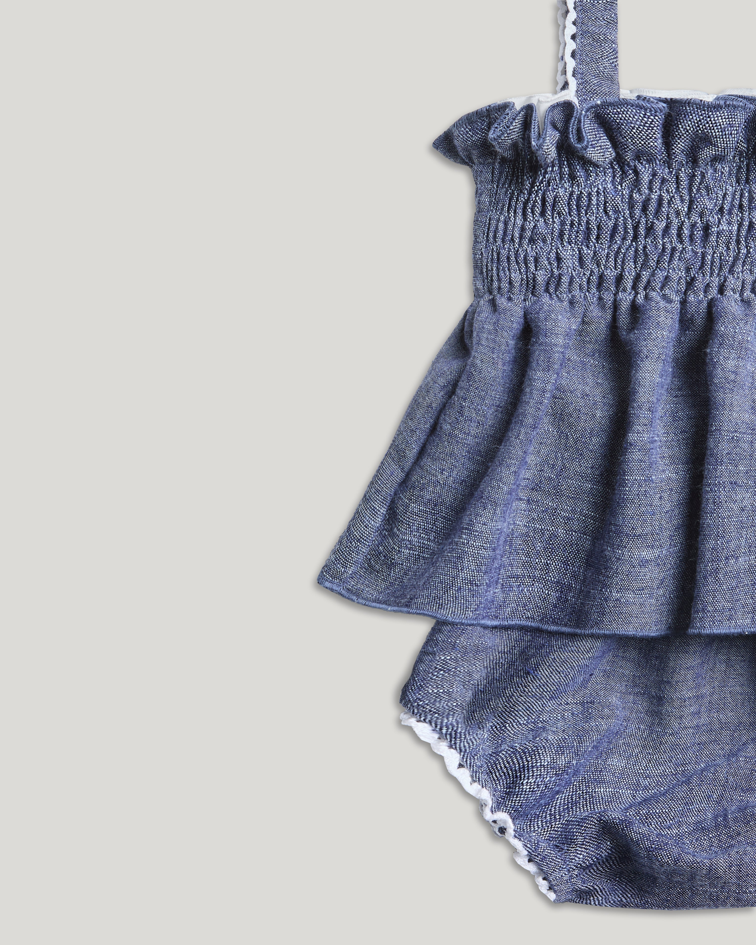 Il top riprende il design della mamma, con bretelle sottili e arricciature delicate. La culotte abbinata completa il look con una vestibilità comoda e giocosa, ideale per esplorare e sentirsi libera.
