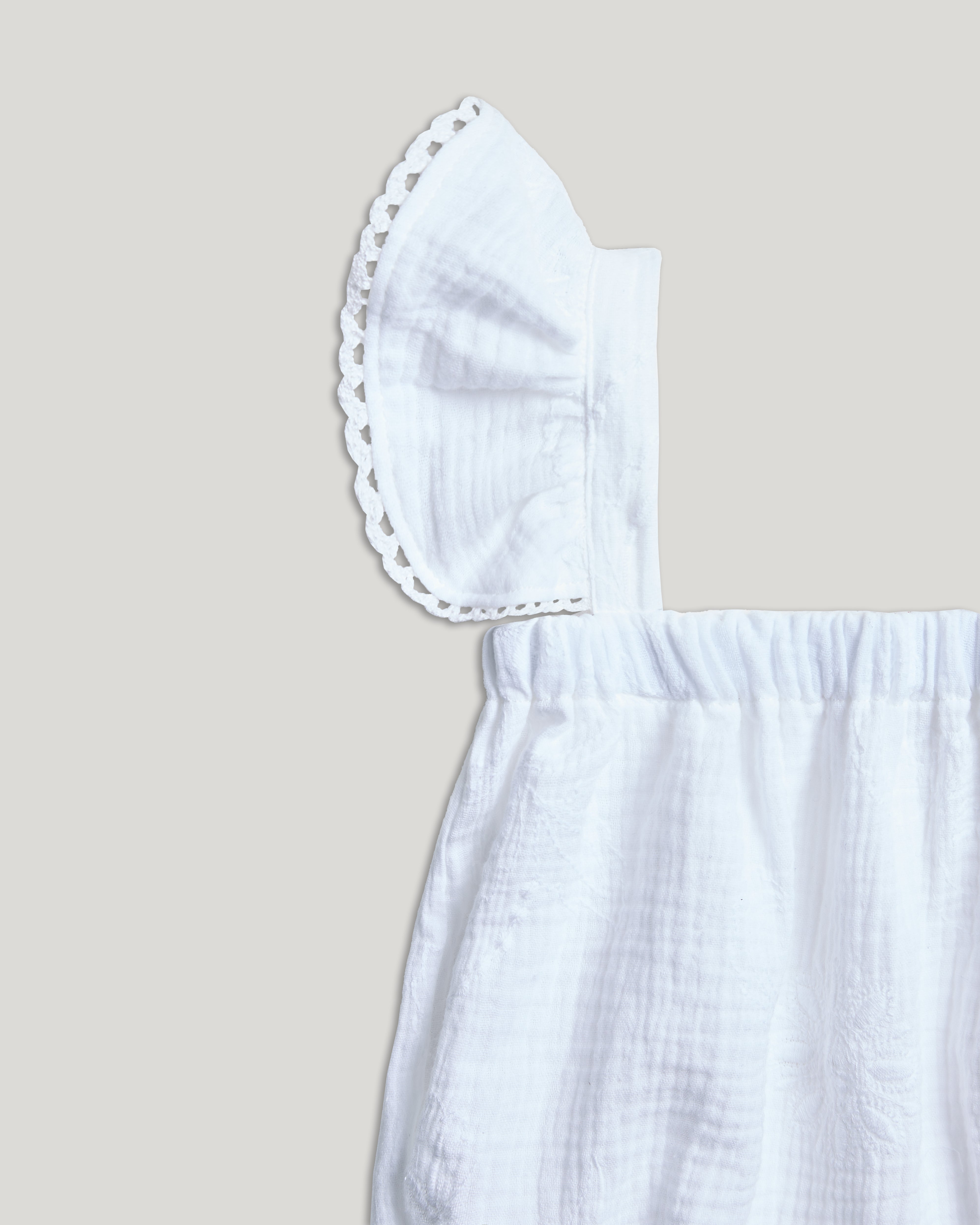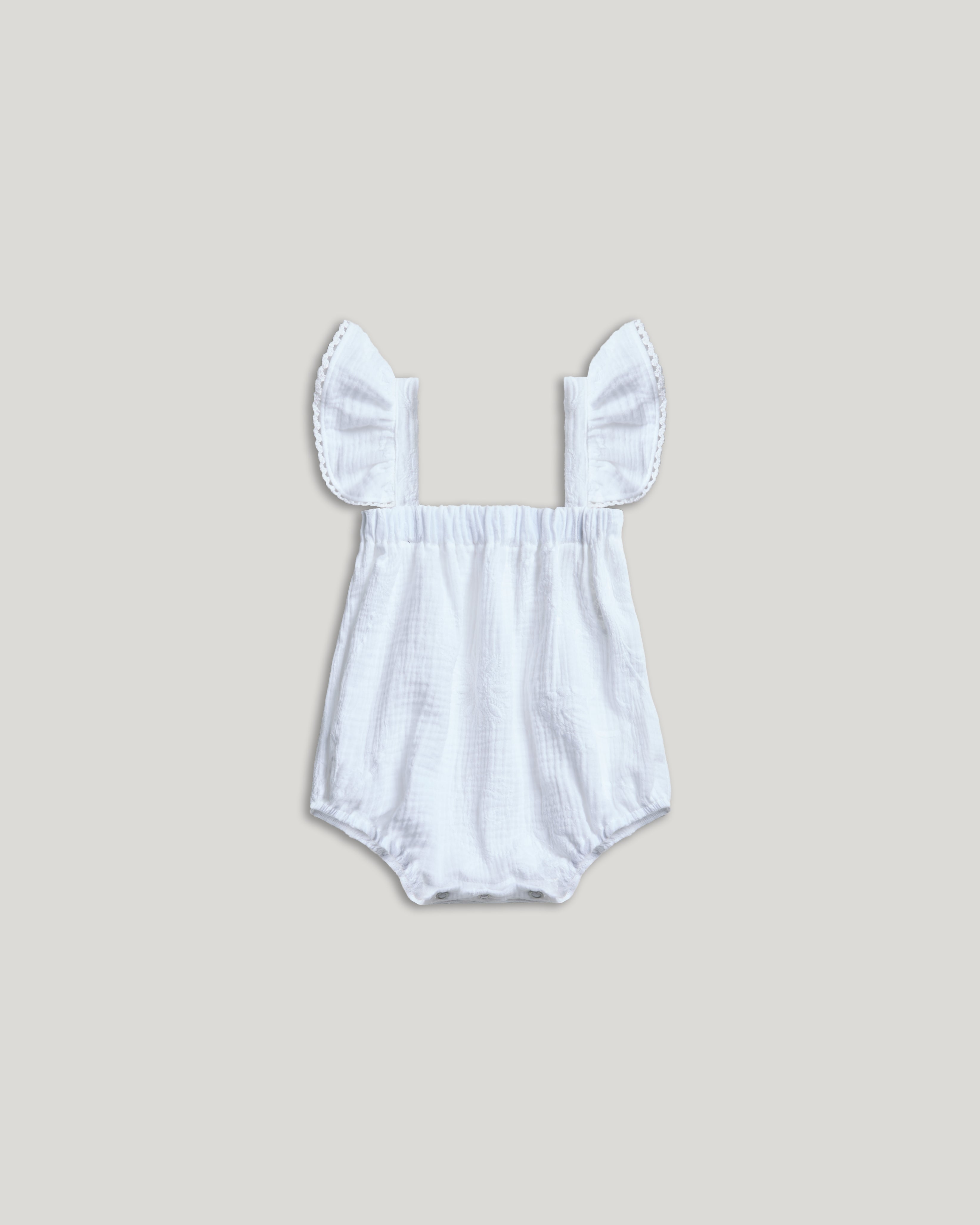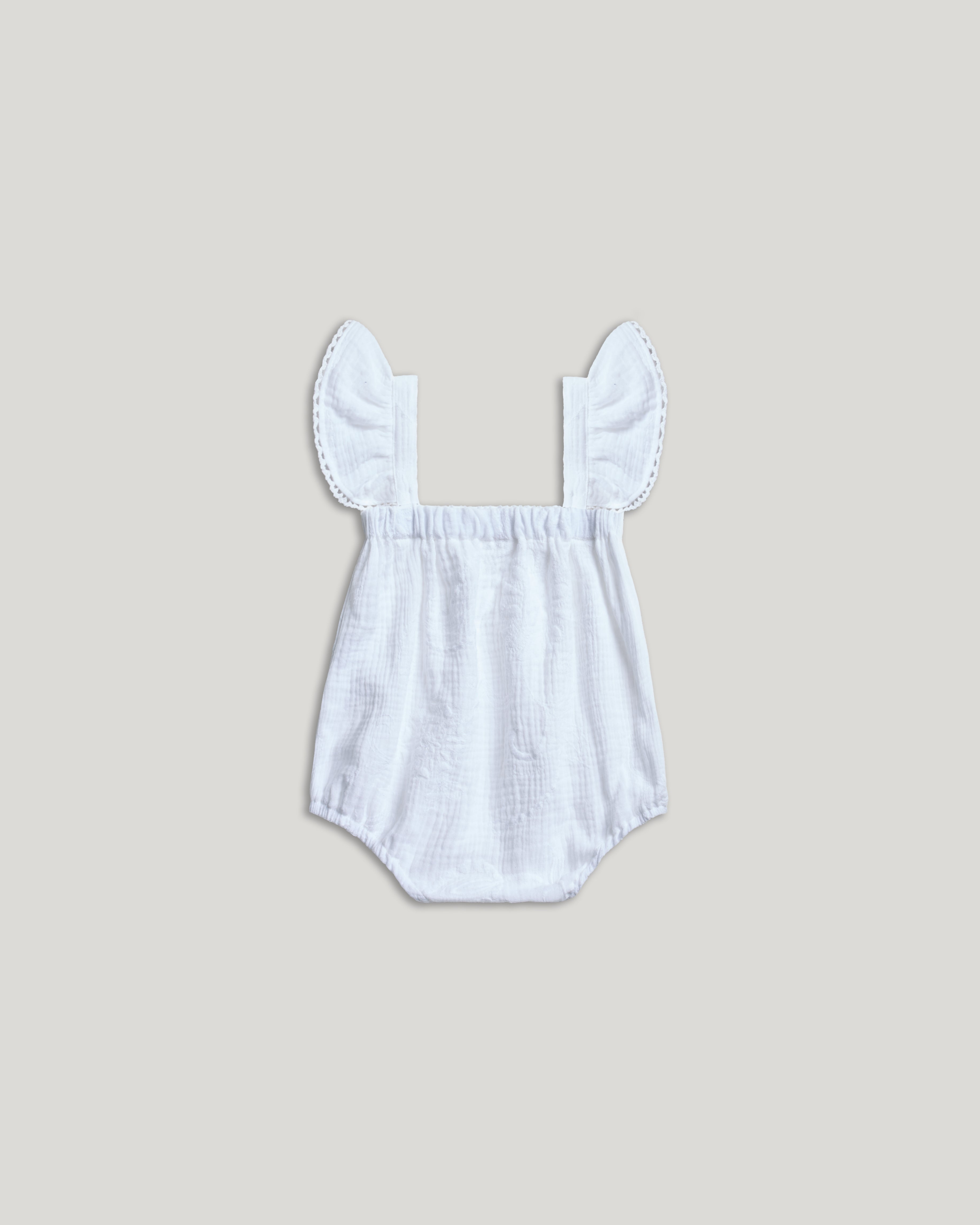 Un pagliaccetto raffinato, pensato per i primi momenti insieme. Le spalline con volant richiamano il design dell’abito della mamma, mentre i bottoncini invisibili permettono di indossarlo con facilità, senza rinunciare allo stile. Fresco e morbido, è il primo piccolo abito che racconta una storia d’amore e connessione.